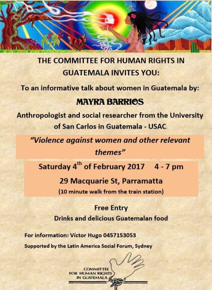 Myra Barrios, anthropologist and social researcher from the University of San Carlos in Guatemala will be the guest speaker at this forum by the Committee for Human Rights in Guatemala. Free entry, drinks & delicious Guatemalan food available. Info Victor Hugo 0457 153 053.