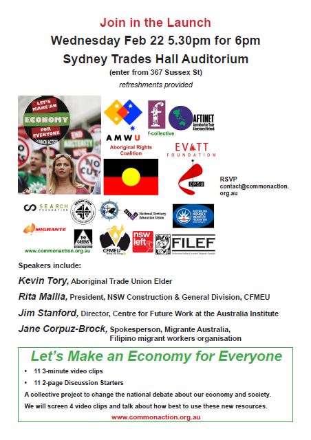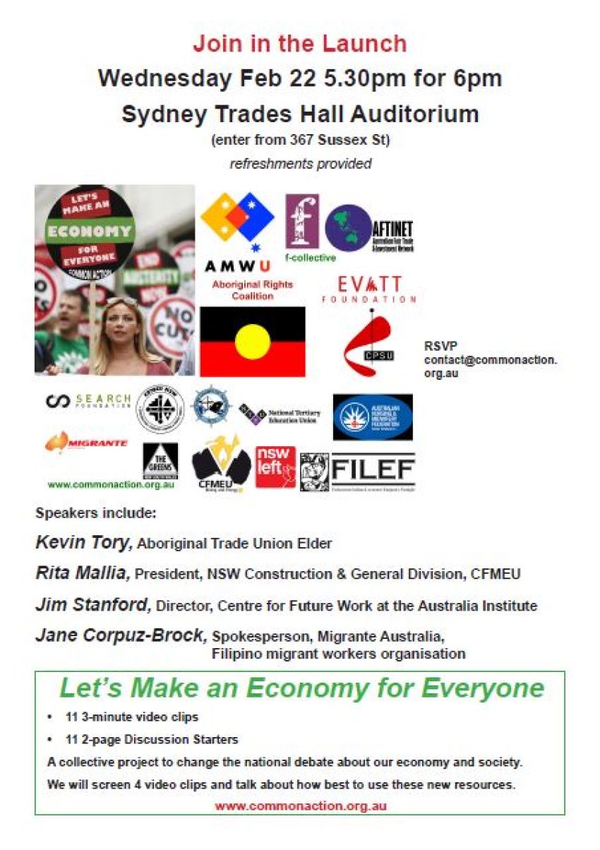 Launch of Common Action Program, a collective project to change the national debate about our economy and society. Speakers include: Kevin Tory, Aboriginal Trade Union Elder; Rita Mallia, President, NSW Construction & General Division, CFMEU; Jim Stanford, Director, Centre for Future Work at the Australia Institute; Jane Corpuz-Brock, Spokesperson, Migrante Australia, Filipino migrant workers organisation. RSVP here.