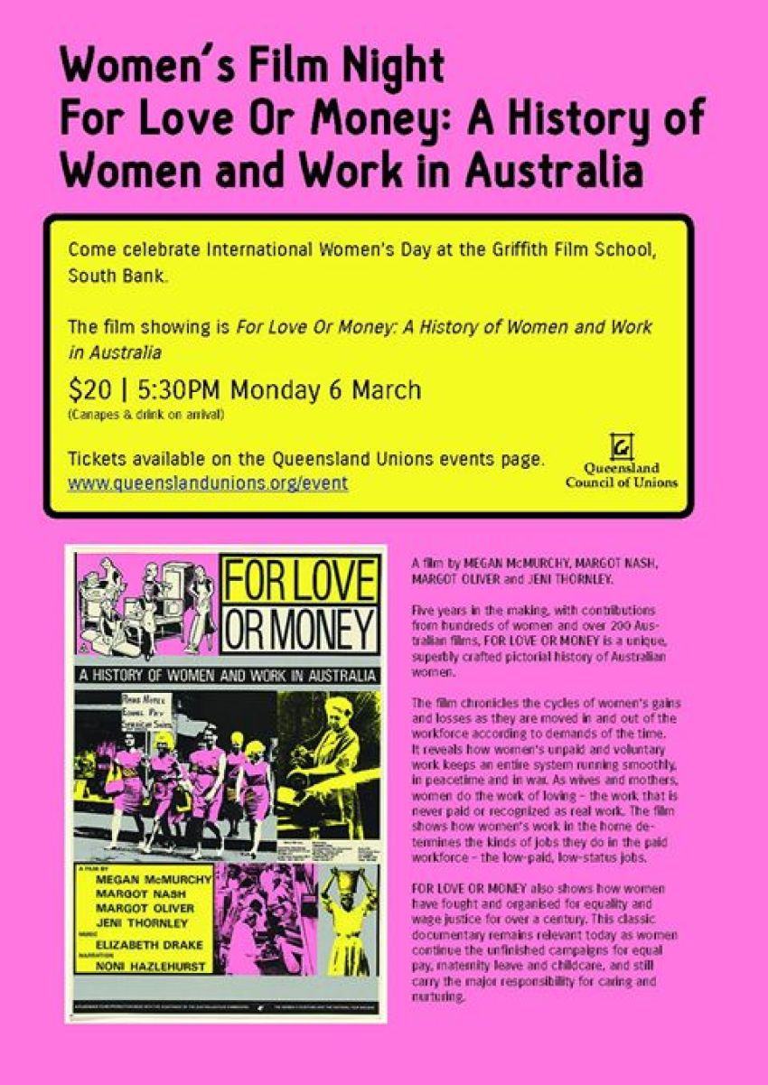 Celebrate International Womens Day with the film "For Love Or Money: A History of Women and Work in Australia" (a groundbreaking movie by Megan McMurchy, Margot Nash, Martot Oliver and Jeni Thornely, released in 1983).