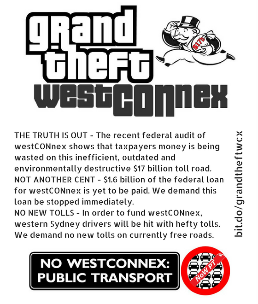 The recent federal audit of westCONnex has confirmed suspicions that taxpayer's money is being misspent by this $17 billion toll road. Protest demanding not one more cent be misspent on this project and opposing the proposed new tolls on M4 and M5. Speakers: Jenny Leong, Greens MP for Newtown; Jodi McKay, Labor MP for Strathfield; Clr Jess Miller and Judith Kiejda, President of Unions NSW. Endorsed by: No WestCONnex - Public Transport, WestCONnex Direct Action, No WestCONnex Annandale, Newtown Residents Against WestCONnex, Rozelle Against WestCONnex, Leichhardt Against WestCONnex, Camperdown Residents Aware of WestCONnex, Tunnel Vision Doco, Save Ashfield Park, Save Sydney Park Camp, Stop WestCONnex Glebe/Forest Lodge.