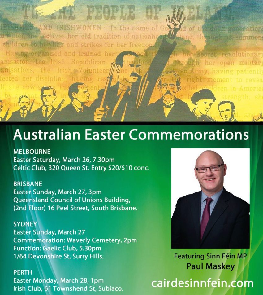 Meet at main entrance. Speaker: Paul Maskey MP Sinn Féin MP for West Belfast. At 5.30pm meet at the Sydney Gaelic Club, Level 1, 64 Devonshire St, Surry Hills. Contact Paddy Gorman for more details on Sydney events: 0418 116 426.