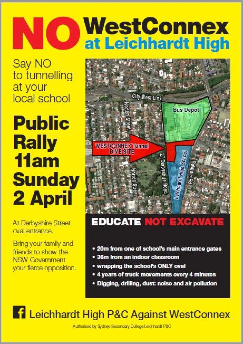 Whether your kids go to Leichhardt High, you live near the proposed tunnel site, or you don’t want large trucks thundering down Balmain Road every five minutes and creating traffic congestion near the bus depot and City West Link (and subsequent outfall for business on Norton Street!), please bring your family and neighbours to this rally to make the Leichhardt Community’s opposition to WestConnex's preposterous proposal to create a tunnel dive site right next to this high school.