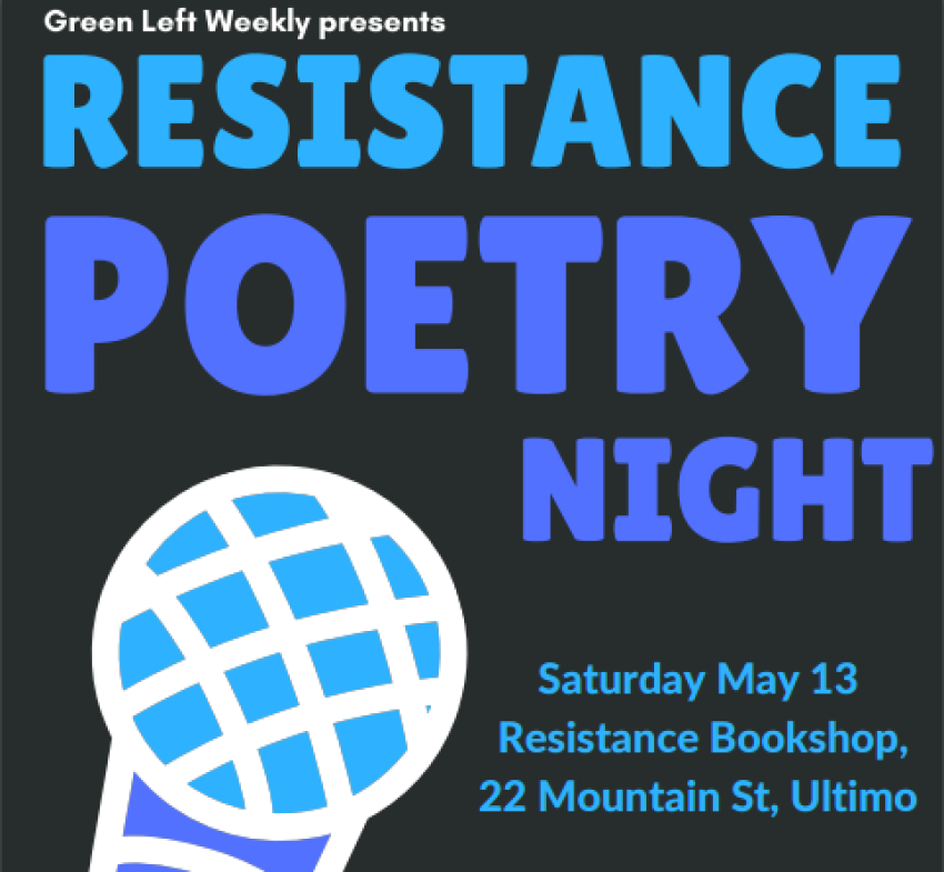 Join Green Left Weekly for an evening of poetry and hip hop to express/celebrate resistance and struggle! With renowned people's poets Lizzy Jarret, Ken Canning, hip hop legend Esky and many many more. Call 0403 517 266 to offer your poetic prowess or find out more. Tasty affordable meal available. Entry $7 concesssion, $12 waged, $20 solidarity. All funds going towards Green Left Weekly.