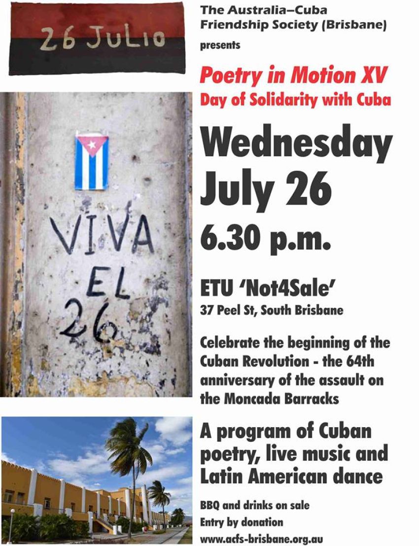 Celebrate the beginning of the Cuban Revolution - the 64th anniversary of the assault on the Moncada Barracks with a program of Cuban poetry, live music and Latin American dance.