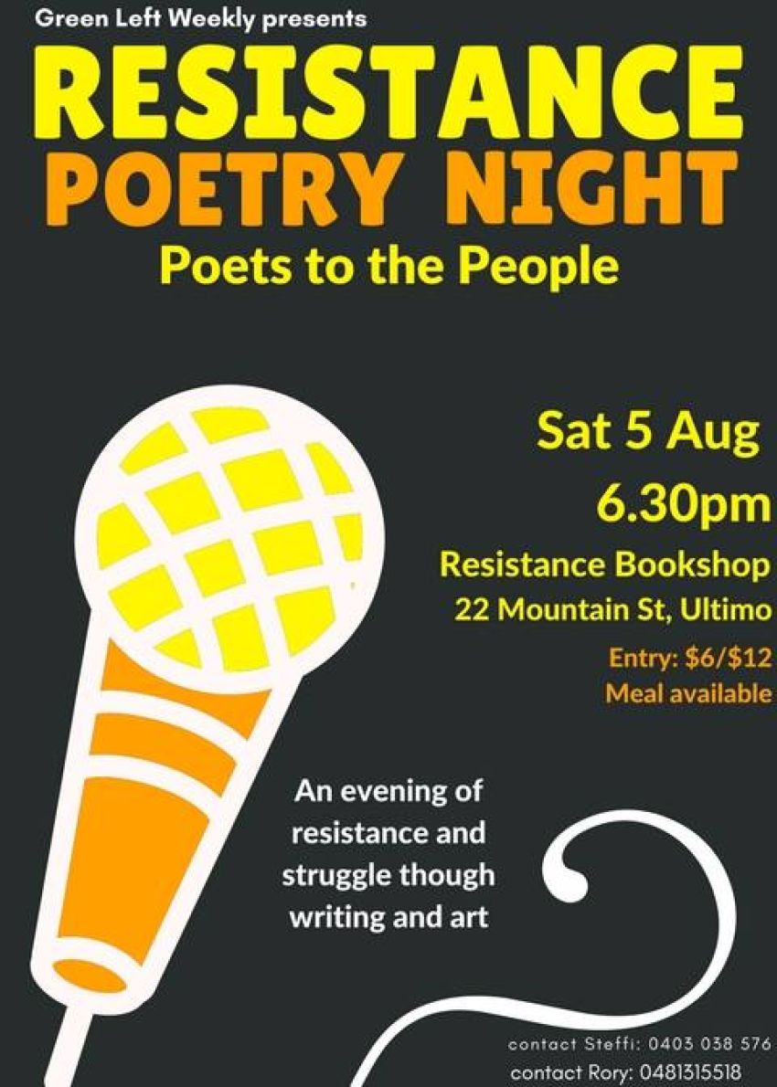 Join us for an evening of poetry, poetry and hip hop to express and celebrate resistance and struggle with renowned people's poets Aboriginal legend Elizabeth Jarret, rising Indigenous hip hop legend MC-Rhyan Clapham DOBBY, and more. Tasty affordable meal available. Call 0418 315 518 or 0403 038 576 to offer your poetic prowess or find out more information. Entry: $6 concesssion, $12 waged, $20 solidarity. All funds going towards activist newspaper Green Left Weekly.