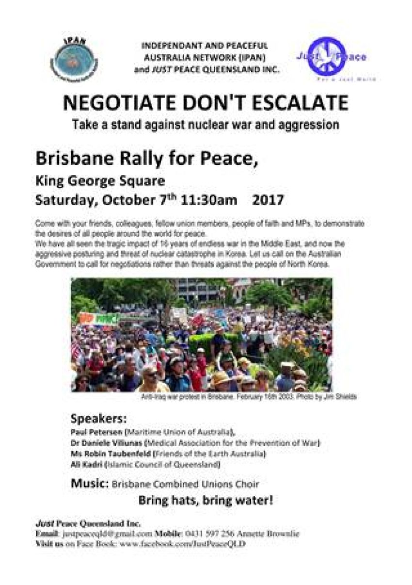 Rally against nuclear war and aggression! Speakers include: Paul Petersen (Maritime Union of Australia); Dr Daniele Viliunas (Medical Association for the Prevention of War); Ms Robin Taubenfeld (Friends of the Earth Australia); Ali Kadri (Islamic Council of Queensland)