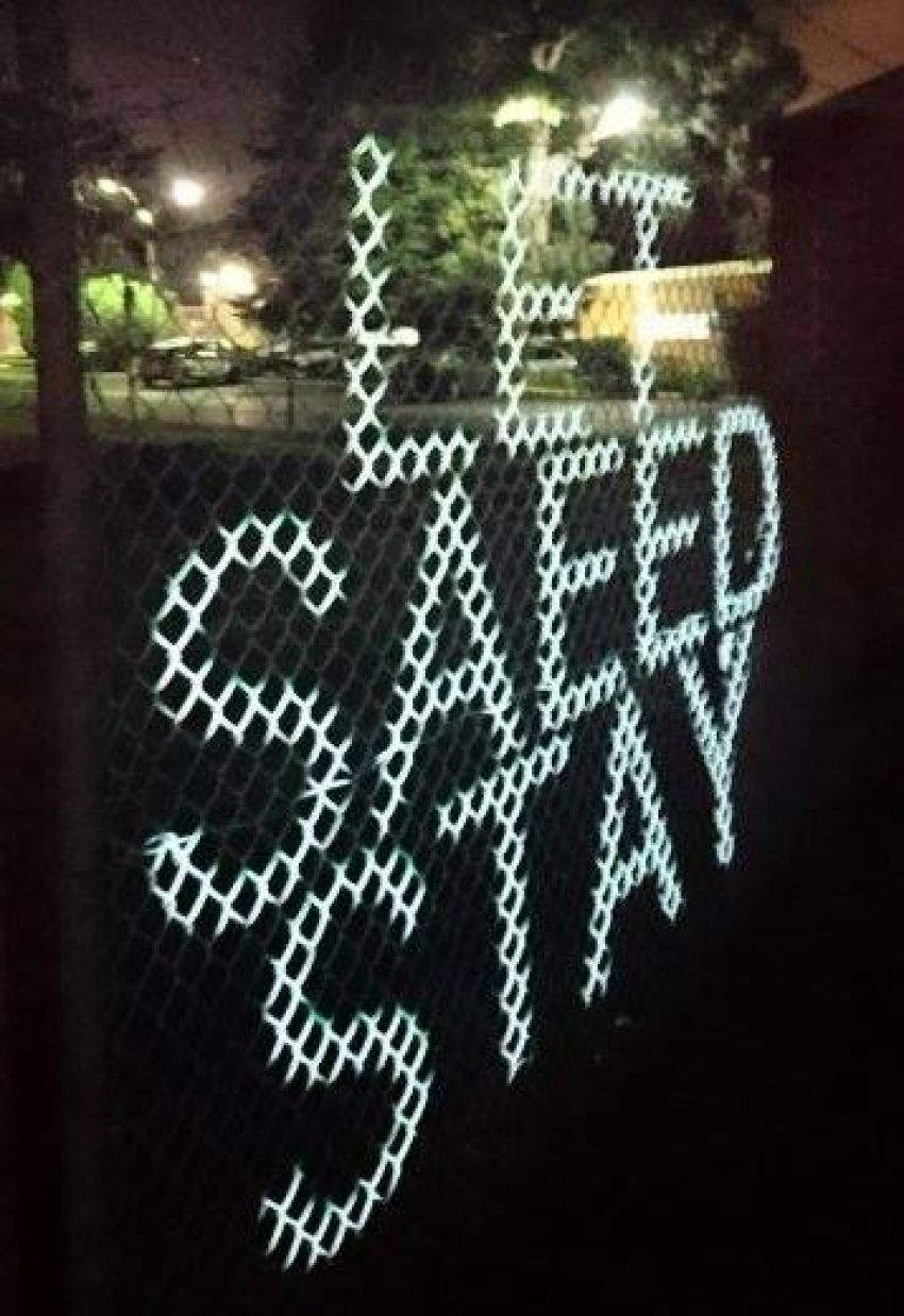 A large sign made of lights was hung on the wall of the detention centre during the night reading “don’t deport to danger”.