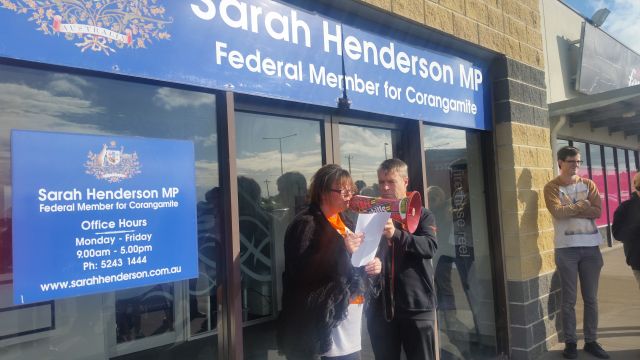 We’re here today to tell Sarah Henderson that the community here in Geelong and Corangamite values penalty rates and the difference penalty rates make to our incomes, our lives, our abilities to participate in our communities and our ability to care for our children.