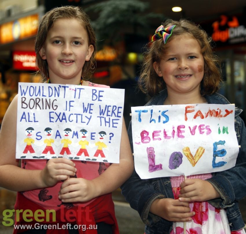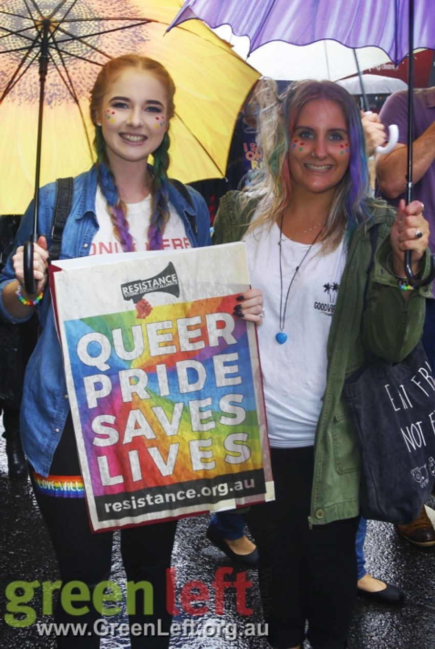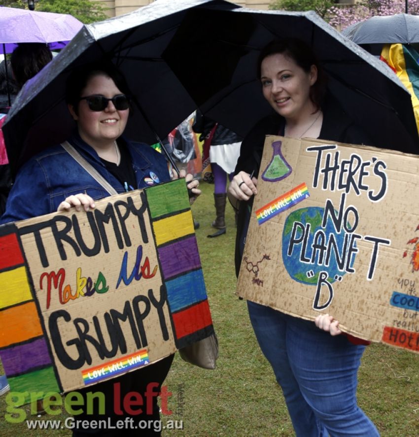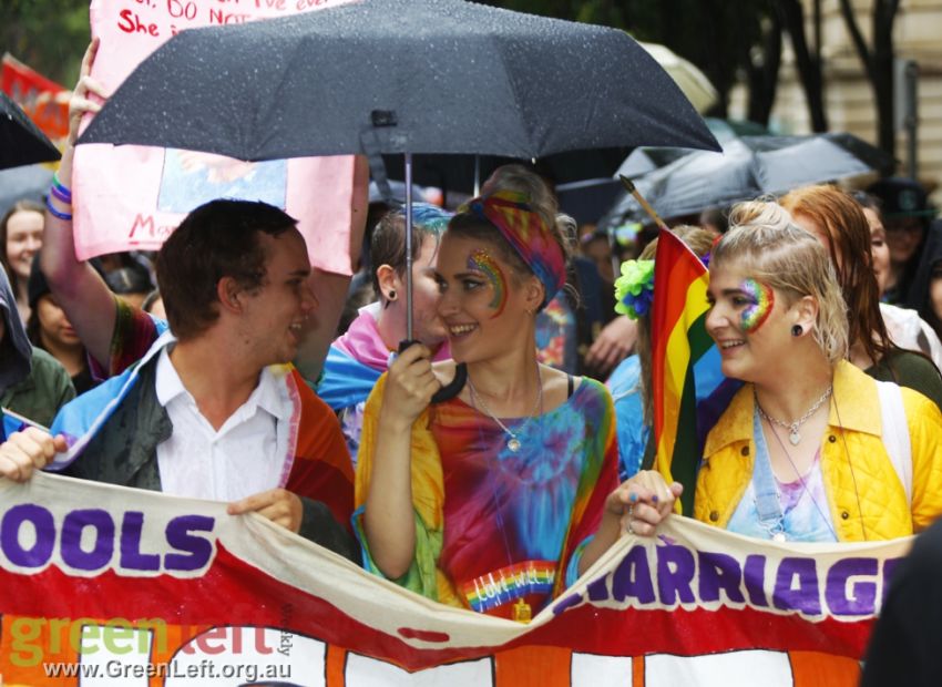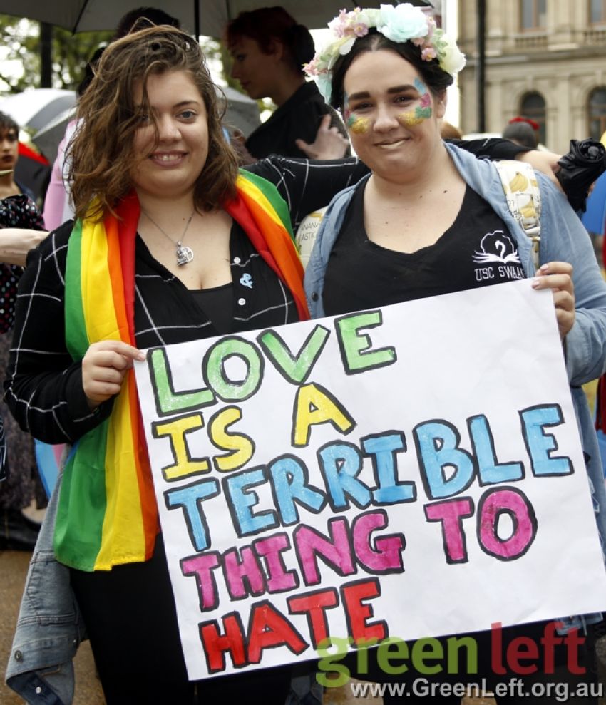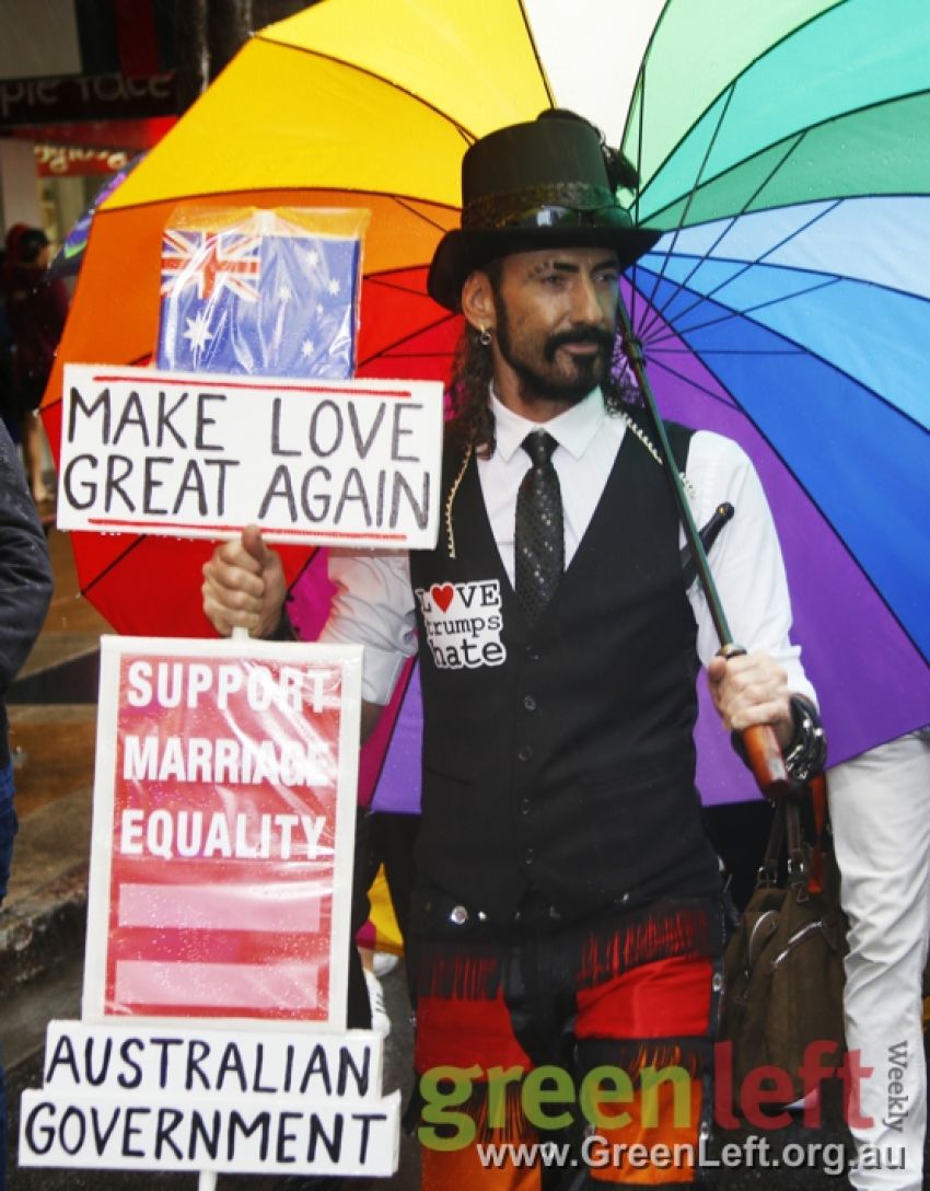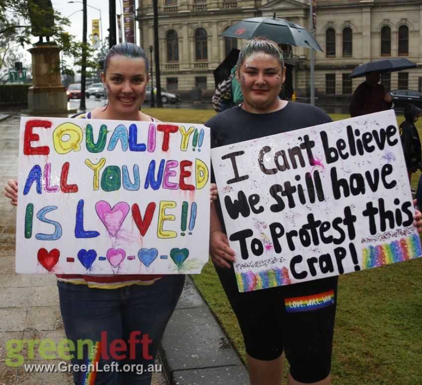 Hundreds defied rainy weather to take part in a vibrant "Love Trumps Hate" rally in Brisbane on June 11.