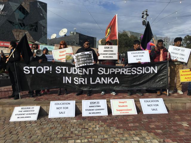 A rally called by the Campaign for Democracy in Sri Lanka was held in Federation Square on July 16. Protesters are opposed to the creation of a private medical college, the South Asian Institute of Technology and Medicine. The Government Medical Officers Association has called for SAITM to be nationalised.