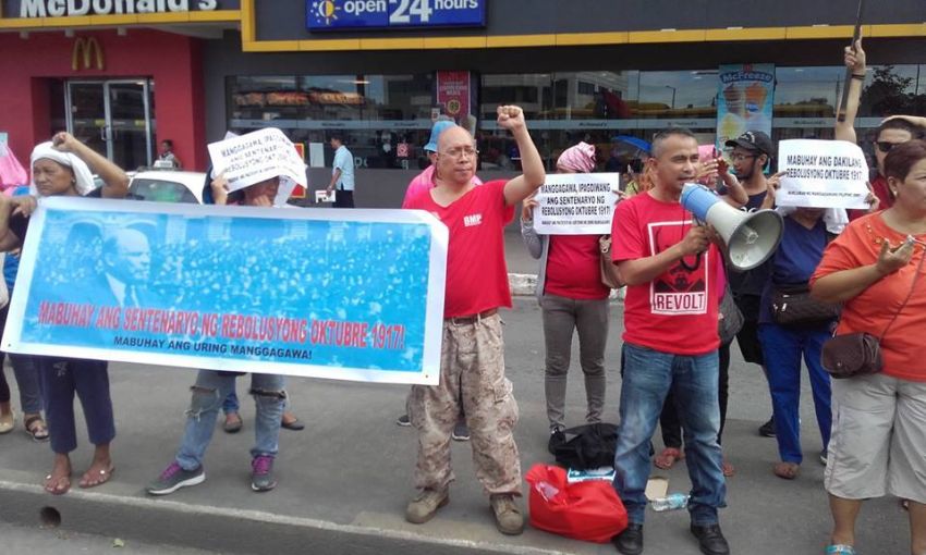 Members of left-wing trade union federation Solidarity of Filipino Workers (BMP) and the socialist Party of the Labouring Masses (PLM) held a public commemoration of the 100th Anniversary of the Russian Revolution on November 7 in Quezon City, Manila. Photo by Gregorio Bituin, Jr.