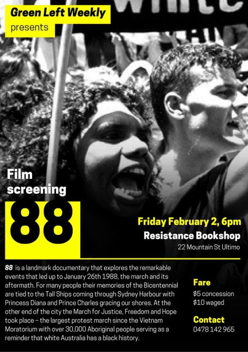 88 is a landmark documentary that explores the remarkable events that led up to January 26th 1988, the march and its aftermath. the March for Justice, Freedom and Hope took place – the largest protest march since the Vietnam Moratorium with over 30,000 Aboriginal people serving as a reminder that white Australia has a black history. Warrior Zachary Joseph Wone, Kabi Kabi Nation of the Dundaburra clan, member of the Maritime Union of Australia will talk about the importance of this rally and the fight for land rights and justice for the Aboriginal and Torres Strait Islander community. Doors open at 5:30, Pay at door, $5 concession; $10 waged.