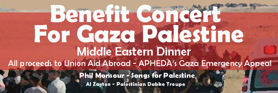 Benefit Concert (including Middle Eastern Dinner). All proceeds to Union Aid Abroad - APHEDA’s Gaza Emergency Appeal to support relief efforts for the people of Palestine. Featuring Phil Monsour - Songs for Palestine and the amazing Al Zayton Dabke Troupe and more.