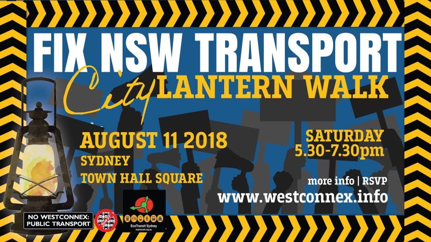 If you support this vision, join us for the Fix NSW Transport — City Lantern Walk on August 11 starting at 5.30 at Sydney Town Hall Square to demand public and active transport be put ahead of WestCONnex toll roads .