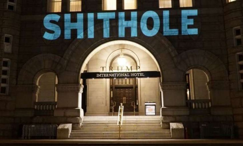 Multimedia artist Robin Bell, of Bell Visuals, also projected the word “SHITHOLE” — with lots of poop emojis — onto Trump’s Washington, DC, hotel on January 13.