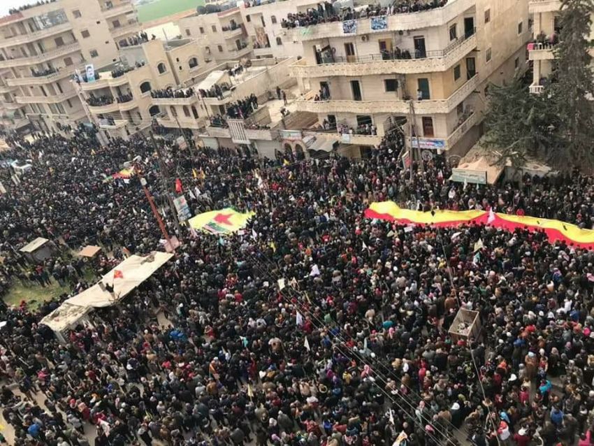 Thousands of solidarity activists from all across the Democratic Federation of Northern Syria defied a threat of bombardment by the Turkish State on February 6 to stand in solidarity with the resistance in Afrin.