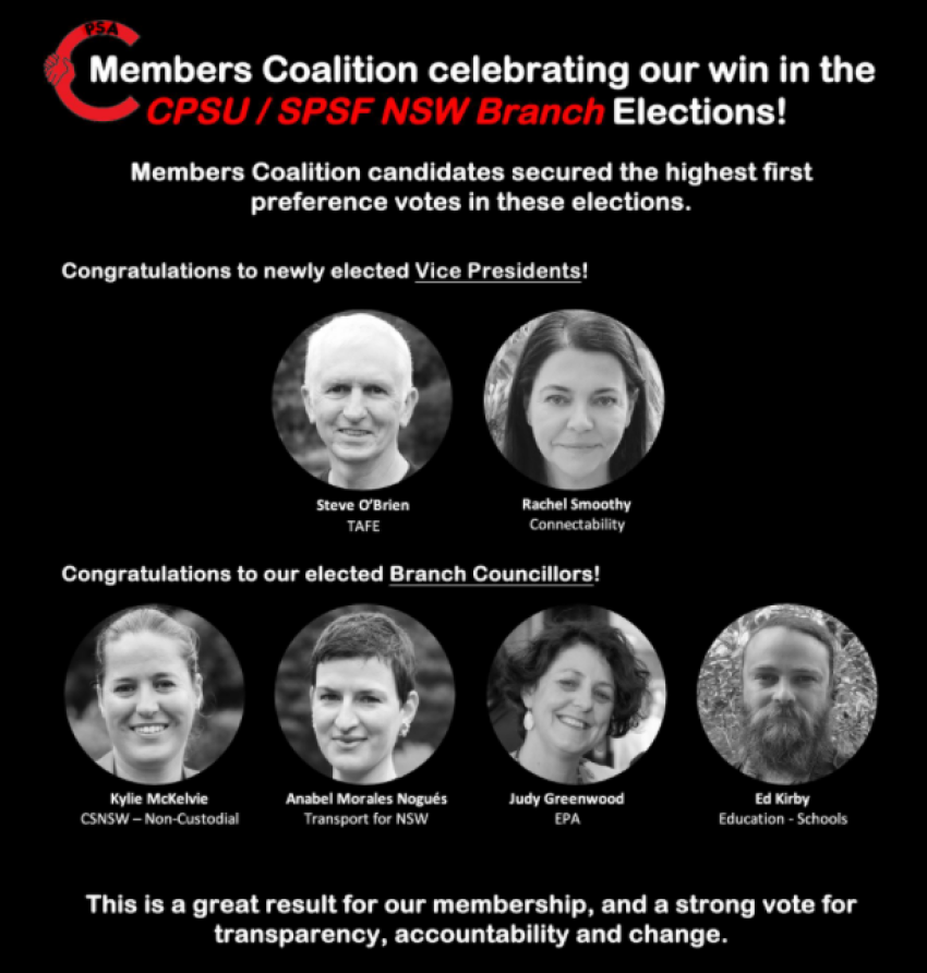 The Members Coalition (MC) team in the NSW Public Service Association (PSA) won more leadership positions on the union’s federal body, the Community Public Sector Union (CPSU) in the recent election.