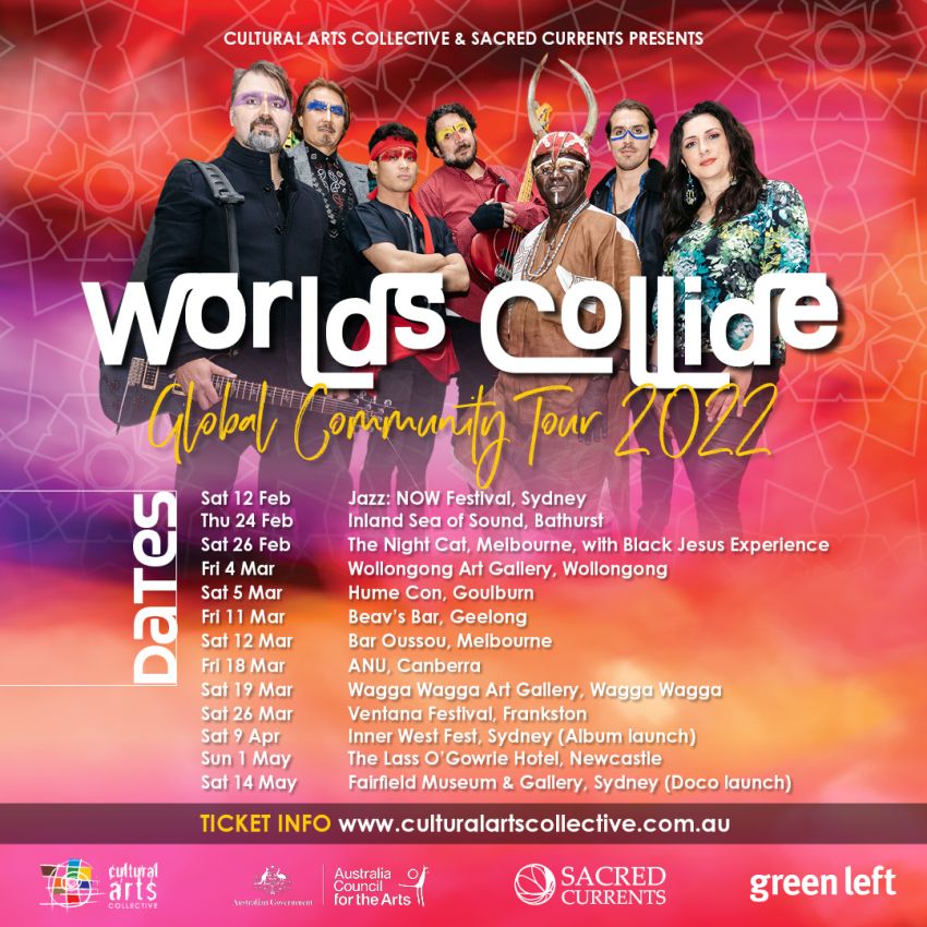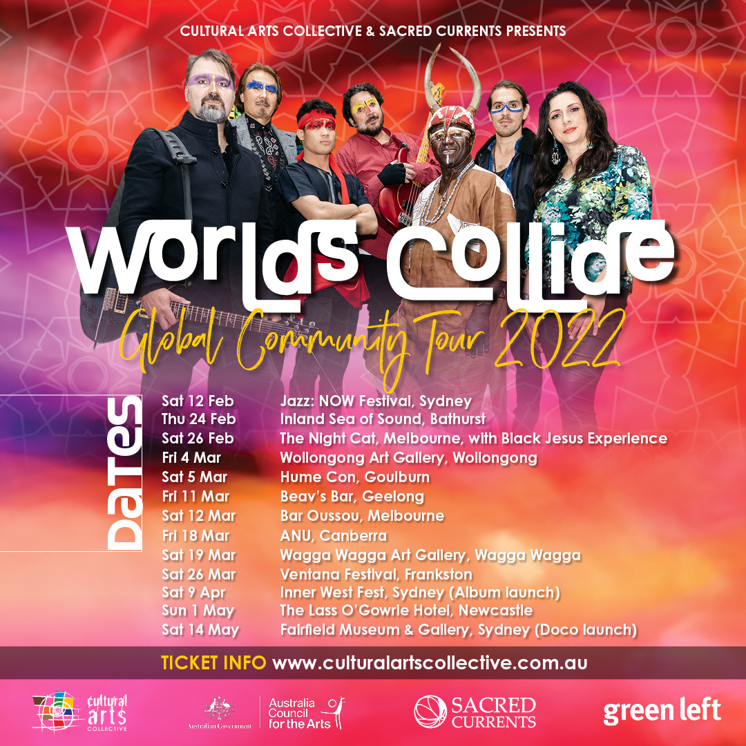 Worlds Collide is a band of 7 artists from 7 different cultural backgrounds from the urban jungles of Western Sydney making contemporary Australian music and connecting with communities across Australia to raise the profile of the power of cross cultural music.