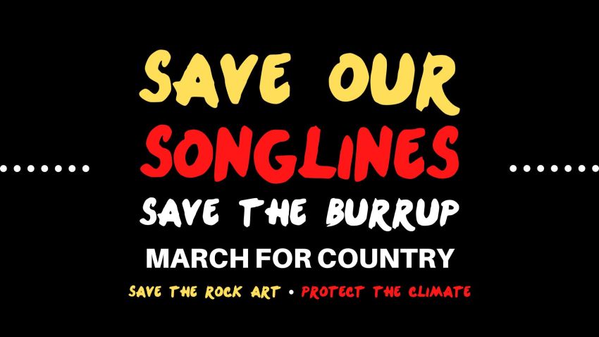 Save our rock art, save our Songlines. Protect the climate. Fight for your kids future. Save the environment. Whales not Woodside.