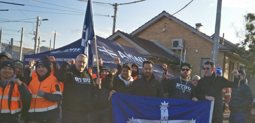 The picket line of welders, boilermakers, fitter and turners and electricians are mostly members of the Australian Manufacturing Workers’ Union, although some are members of the Electrical Trades Union and the Rail, Bus and Tram Union.