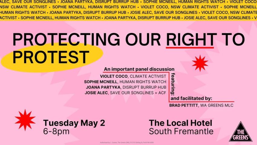 Join Dr Brad Pettitt MLC in the Local Hotel for a Q&A with climate and human rights activists Violet Coco, Josie Alec, Joana Partyka, and Sophie McNeill as they unpack the urgent need for action, police overreach, and how we balance our right to protest - and learn how you too can fight for our future!