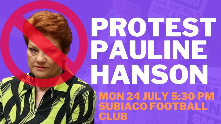 These are bigoted and noxious political ideas, based on a warped view of reality, that need to be destroyed. She should be protested, she should be fought, and she should be pushed out of Perth for her extremism, her racism and her hatred. Join the protest to fight and stand up against Hanson’s racist bigotry and to send a message that she is absolutely not welcome here, or anywhere.