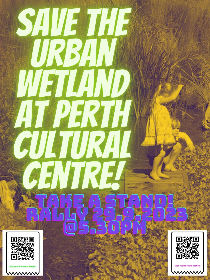 However, a sneak peek into the updated 2023 design as reported by an ABC News article dated 5 September 2023 revealed that “there will be no new wetland within the Perth Cultural Centre rejuvenation project”. Instead, it would be replaced with pavement for a thoroughfare to Beaufort Street. This Wetland is now in danger of demolition. We need your support in its preservation.
