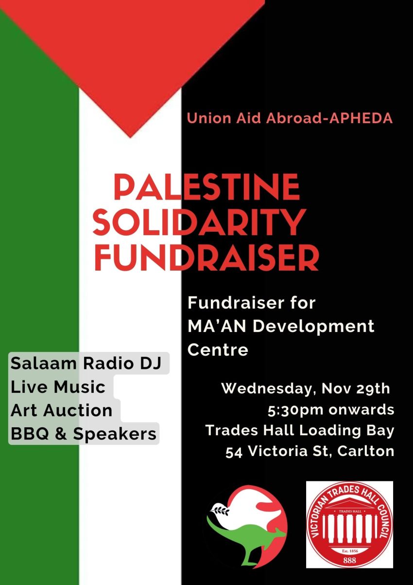 Join Union Aid Abroad-APHEDA at Trades Hall as we show our solidarity and will raise much needed funds for the people in Gaza. All proceeds will go to our emergency appeal in support MA’AN Development Center, a partner organisation of 34 years with over two hundred staff in Gaza.