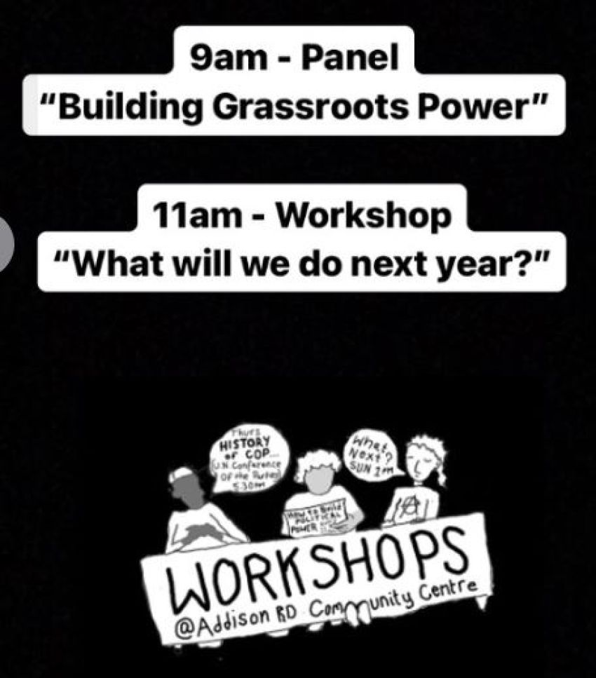 11am join the workshops on where to next with climate cop out and it’s viability going forward as a opportunity for collaborative protest and resistance especially with Australia looking to host COP in 2026