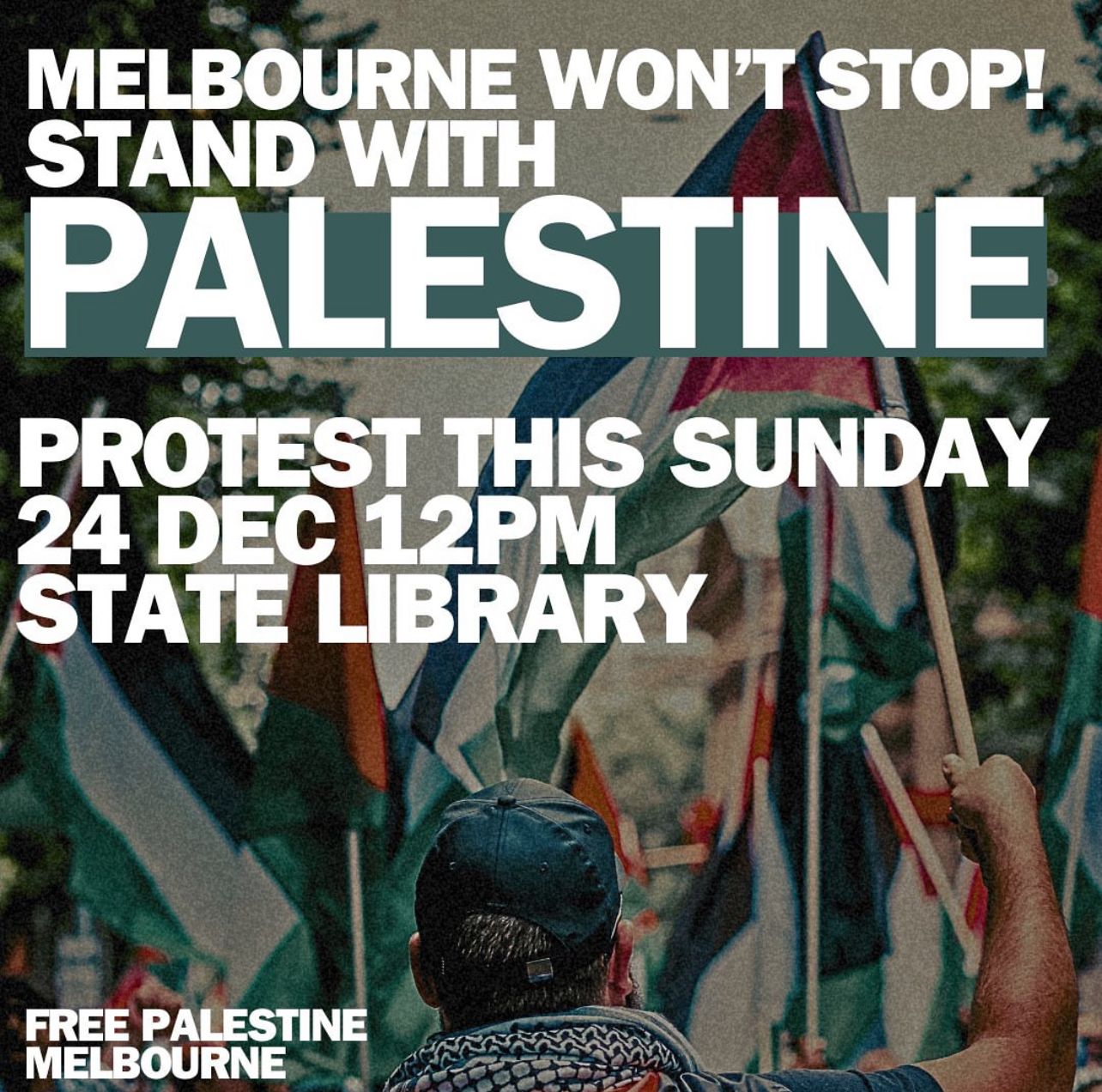 Free Palestine Melbourne Weekly protest in Naarm/Melbourne every Sunday at 12pm at the State Library until a ceasefire is called.