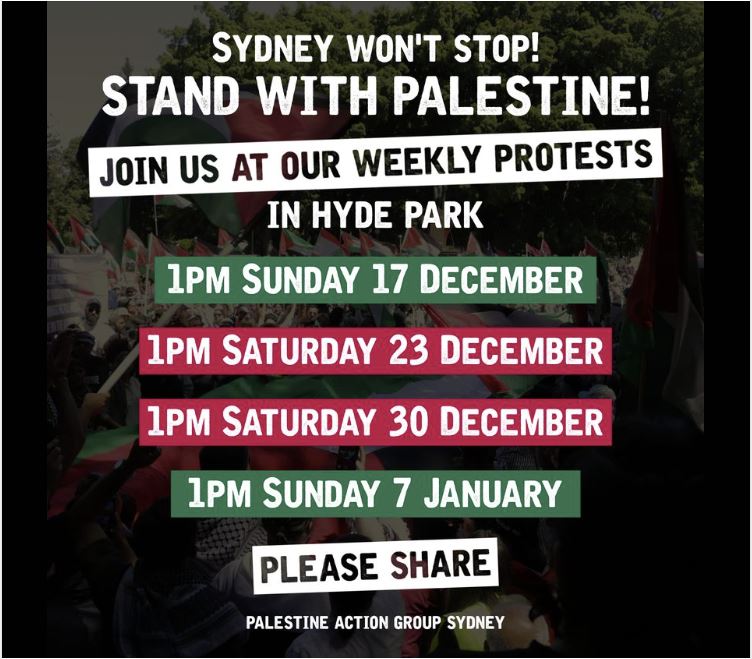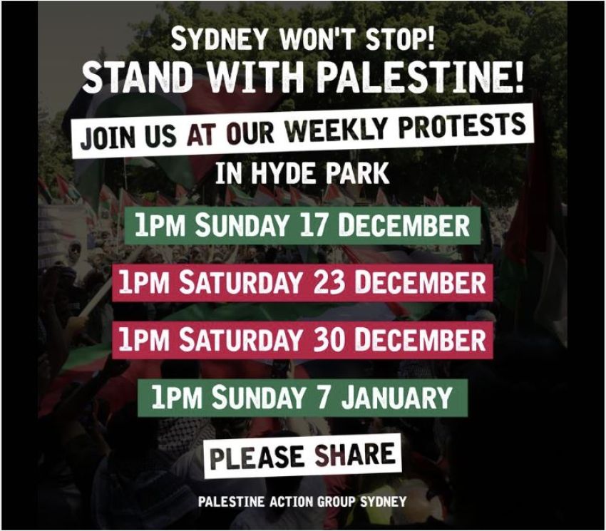 Palestine Action Group will continue holding mass weekly protests over the xmas/new year period. Israel continues its genocide in Gaza, so we will keep protesting!