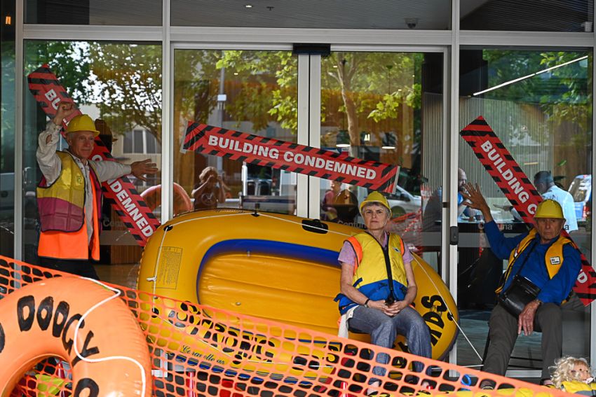 More than 30 supporters of Extinction Rebellion ACT and Stop Fossil Fuel Subsidies gathered at APPEA to disrupt and show solidarity with Lismore’s flood victims — 6000 of whom are still waiting to hear about rehoming, a year on.