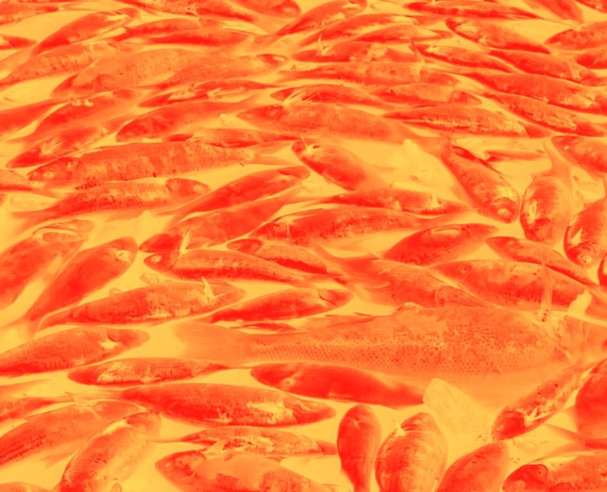 Millions of dead fish float on the surface of the river. Native bony herring and introduced young carp, as well as a few mature Murray cod and golden perch.