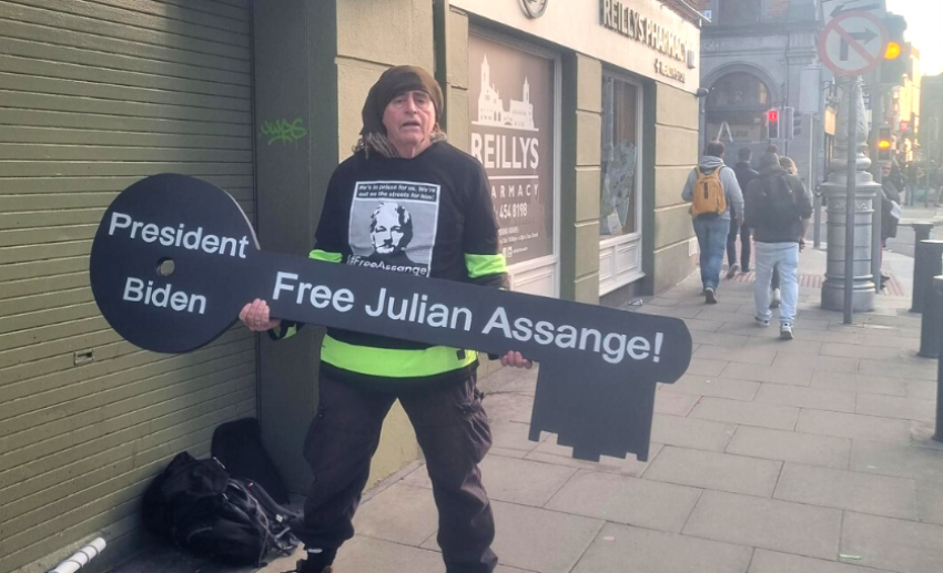 Irish-Australian anti-war activist Ciaron O'Reilly was arrested outside Dublin Castle on April 13, while attempting to deliver a 2 metre-long key to Julian Assange's prison cell to United States president Joe Biden.