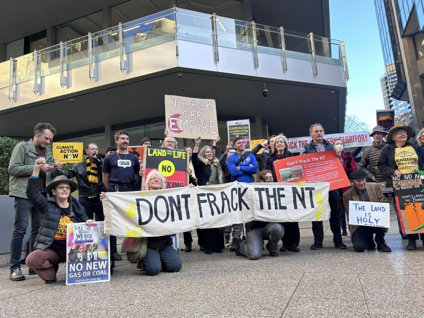 350.org organiser Alessandro Moliterno told the crowd: “Empire Energy is pushing ahead to frack the Beetaloo Basin despite Traditional Owners telling them ‘No!’ Over 85% of the NT is covered in exploration licences. Empire currently has a permit to frack an area twice the size of Tasmania and they’ve been given millions by their mates in the former Morrison government to speed up their plans.”