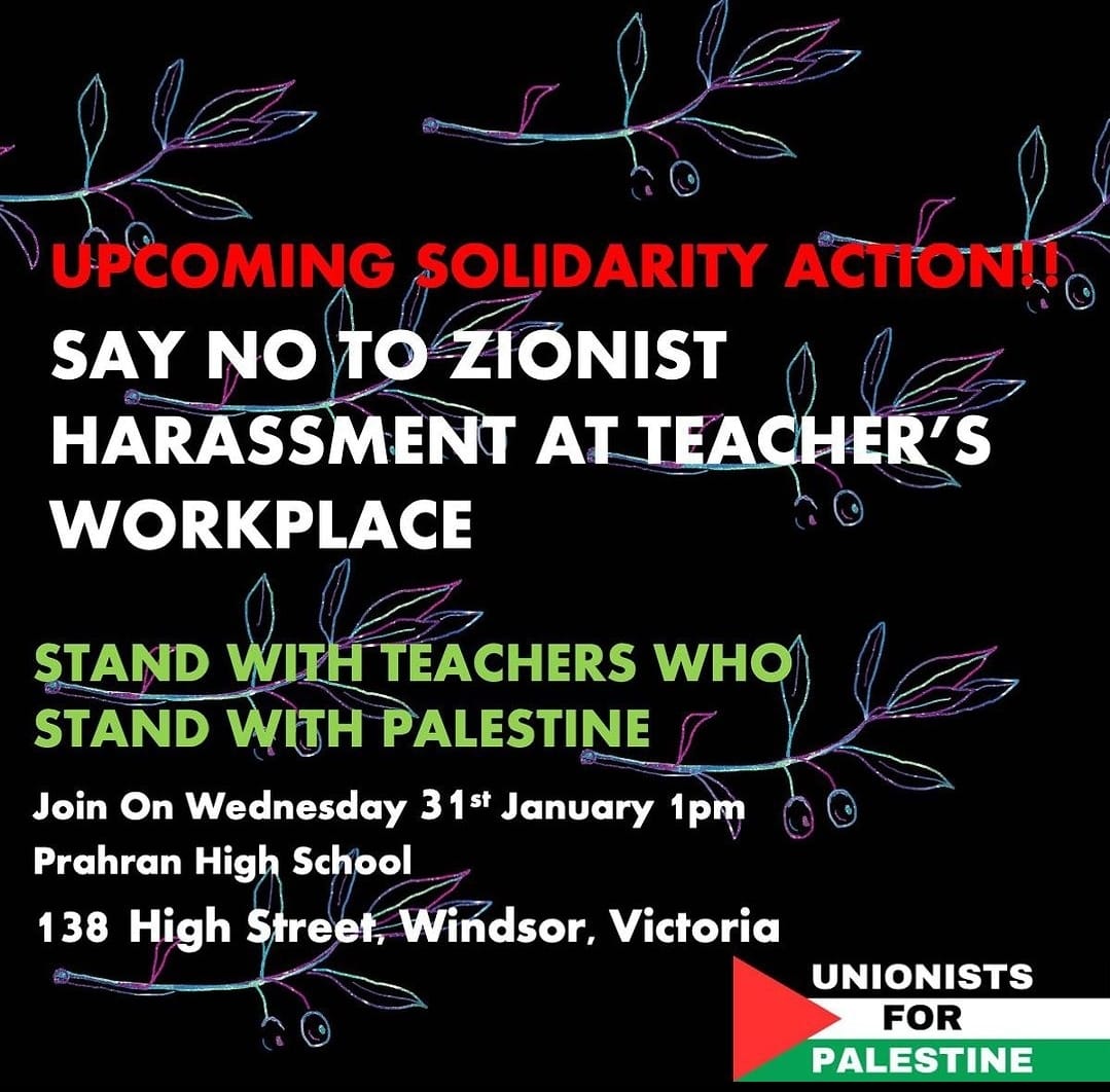 Come Join us on Wednesday the 31st at 1pm outside Prahran High School to say NO to Zionist harassment and silencing and to stand in solidarity with Jason
