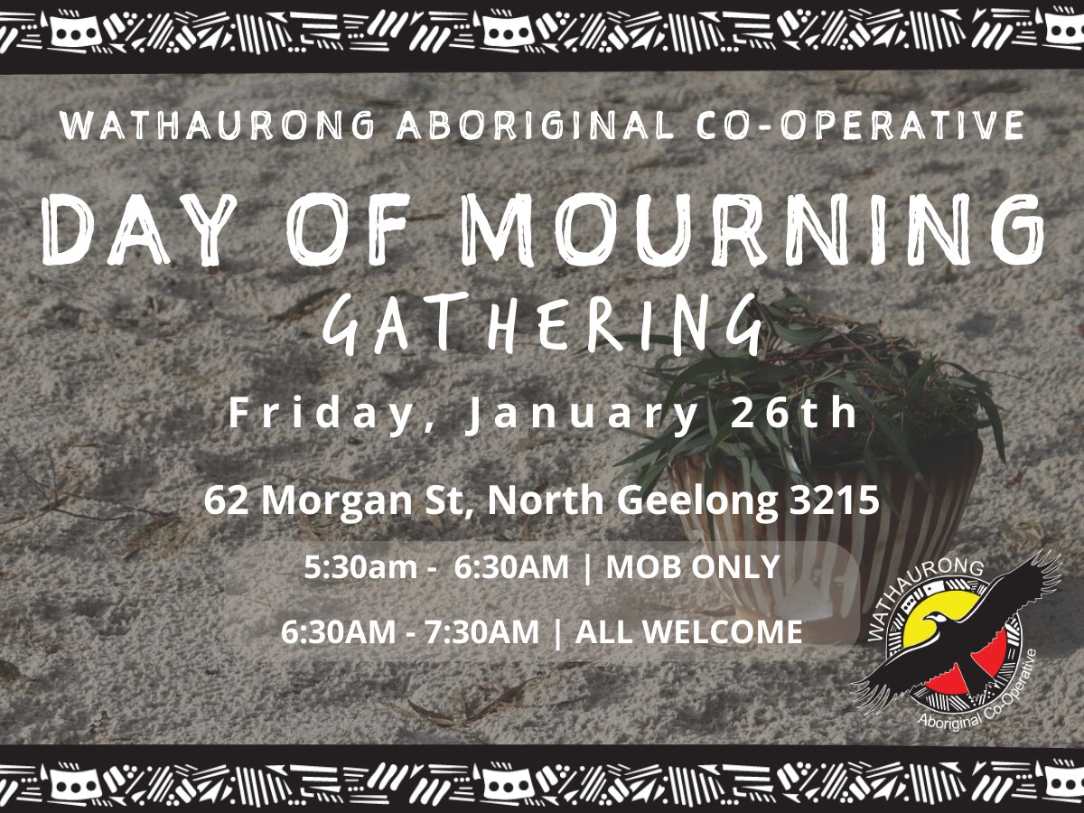 On Friday January 26th 2024, Wathaurong Aboriginal Co-operative will be hosting a dawn service to commemorate a Day of Mourning at 62 Morgan Street, North Geelong.