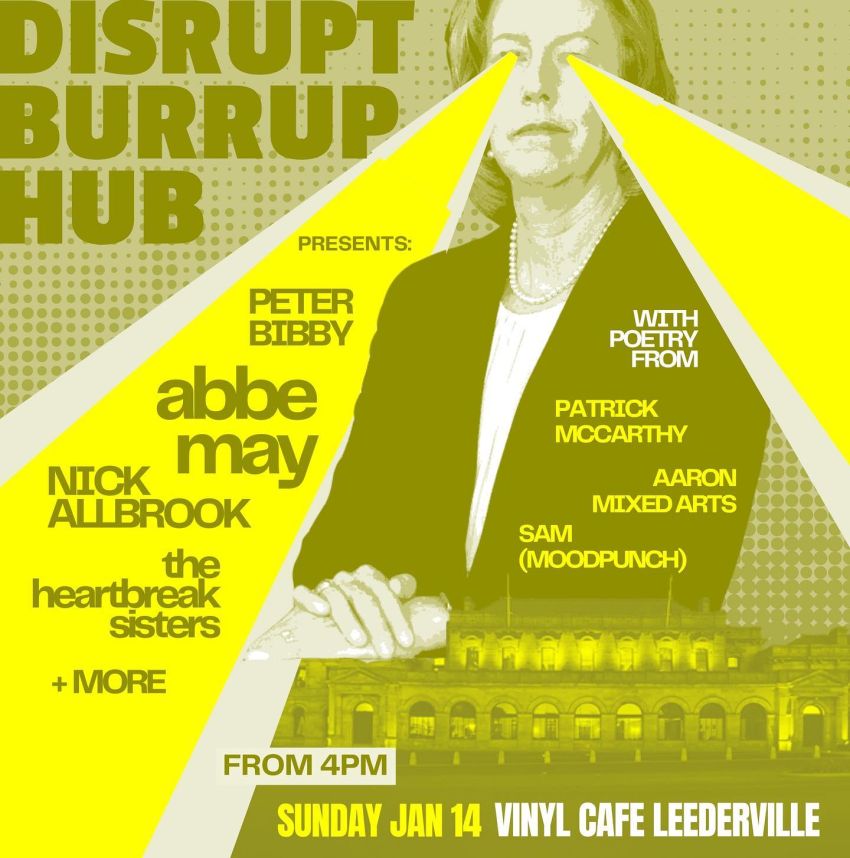 We've put together an A+ line-up of some of Boorloo/Perth's best artists for the first of our Disrupt Burrup Hub presents... event series. Featuring music from: Abbe May, Peter Bibby, Nick Allbrook, The Heartbreak Sisters and more; and poetry from Patrick McCarthy (also our MC for the evening), Sam Bloor (Mood Punch) and more!