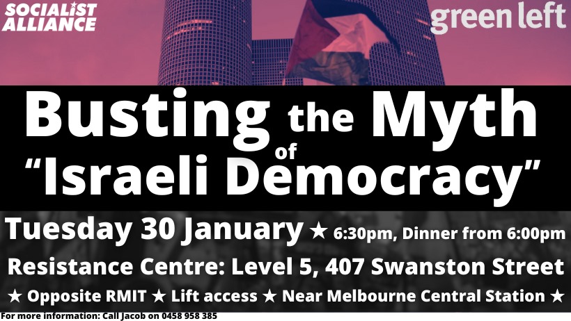 Israel claims to be the only democracy in the middle-east. The reality is different. Israeli democracy is based on Zionist indoctorination; racist citizenship laws; and a supremacist "Jewish" state in which Palestinians are treated as second class. Join Green Left & Socialist Alliance for this discussion.