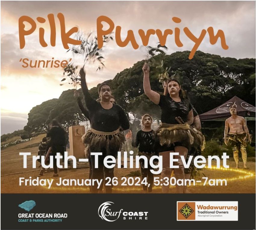 Wadawurrung Traditional Owners welcome the Surf Coast community to Country in Torquay on 26 January for reflection at Pilk Purriyn – sunrise – and deep listening to historic truth-telling. Welcoming people of all ages, genders, races, religions and backgrounds.