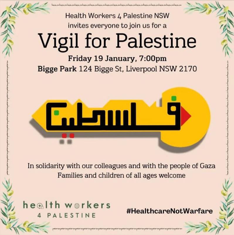Healthworkers 4 Palestine NSW will be holding our next vigil on Friday the 19th of January, in solidarity with our Palestinian colleagues and with the people of Gaza. This vigil is part of a global movement of health workers calling for an immediate and permanent ceasefire.