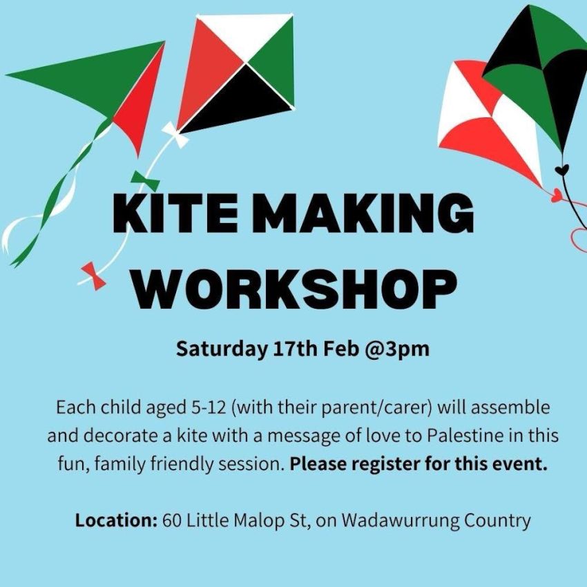 Join us for Bringing Back Love, a two part community event celebrating unity, culture and hope for Palestine. Named after a line in Palestinian writer Rafeet Alareer’s poem ‘If I Must Die’, Bringing Back Love invites everyone to come together and express support for Palestine in a positive and meaningful way, by making kites and gathering to fill the skies over Geelong with a message of hope and peace for the children of Palestine.