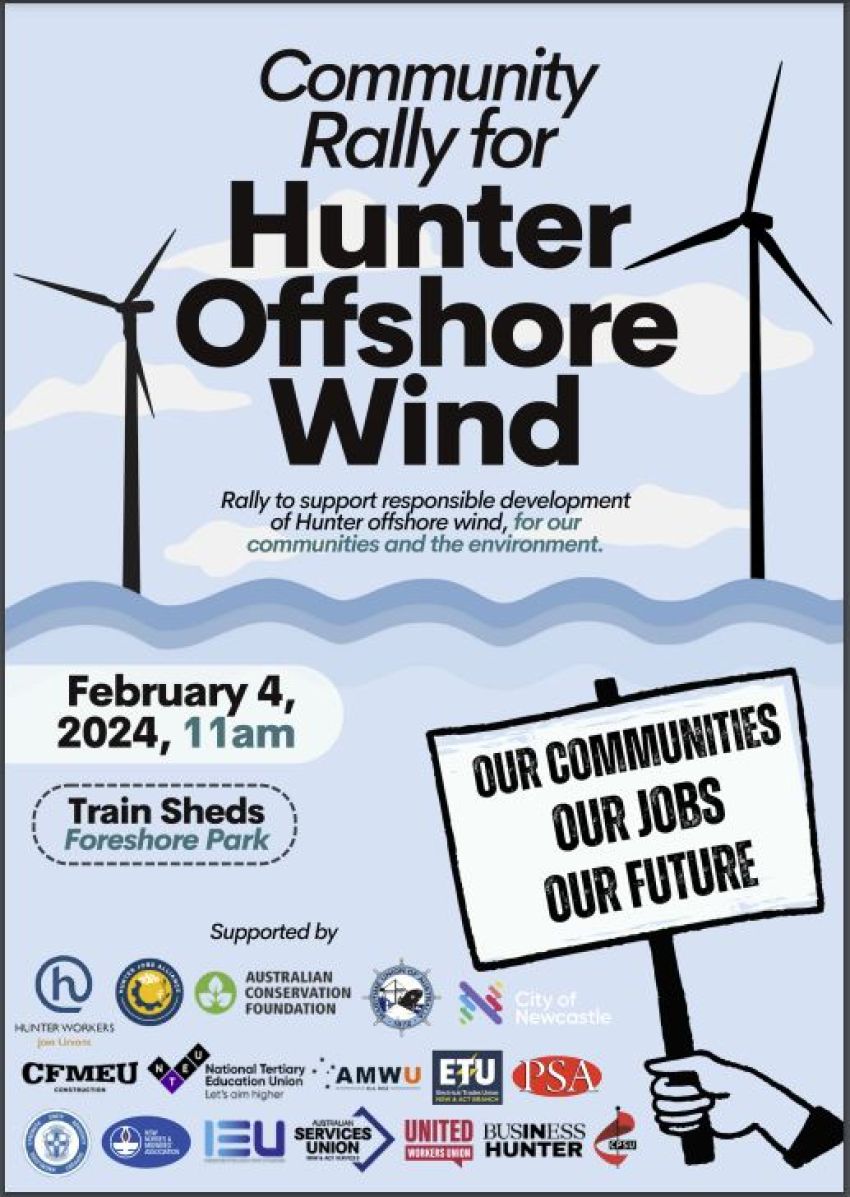 Rally to support responsible development of Hunter offshore wind, for workers, our communities and the environment.