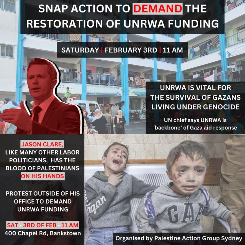 Protest at Jason Clare's office to demand the government restore funding to UNRWA immediately!