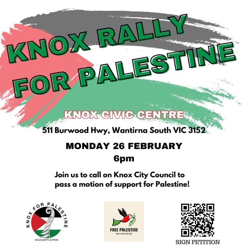 We call on Knox residents and supporters across Naarm to join us in our rally for Palestine outside Knox City Council on Monday February 26th. Help us to demand Knox City Council pass a motion in support of Palestine.