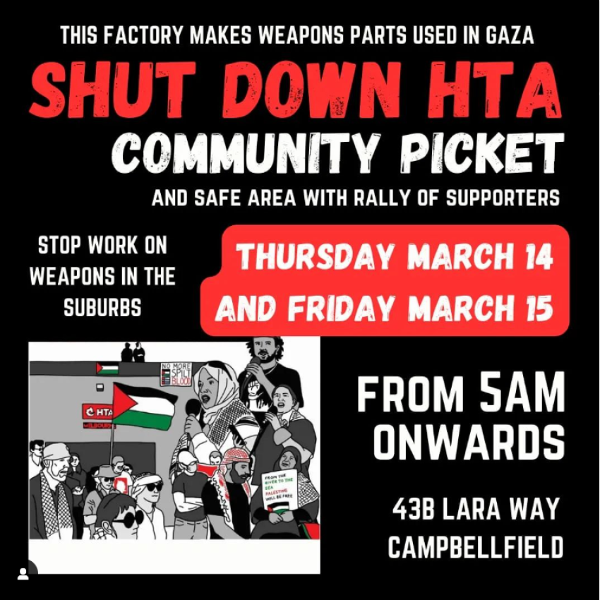 Tell your friends, tell your neighbours in Campbellfield and around. Get ready to join the community picket to ensure no work on weapons happens in the suburbs for another two days this week.