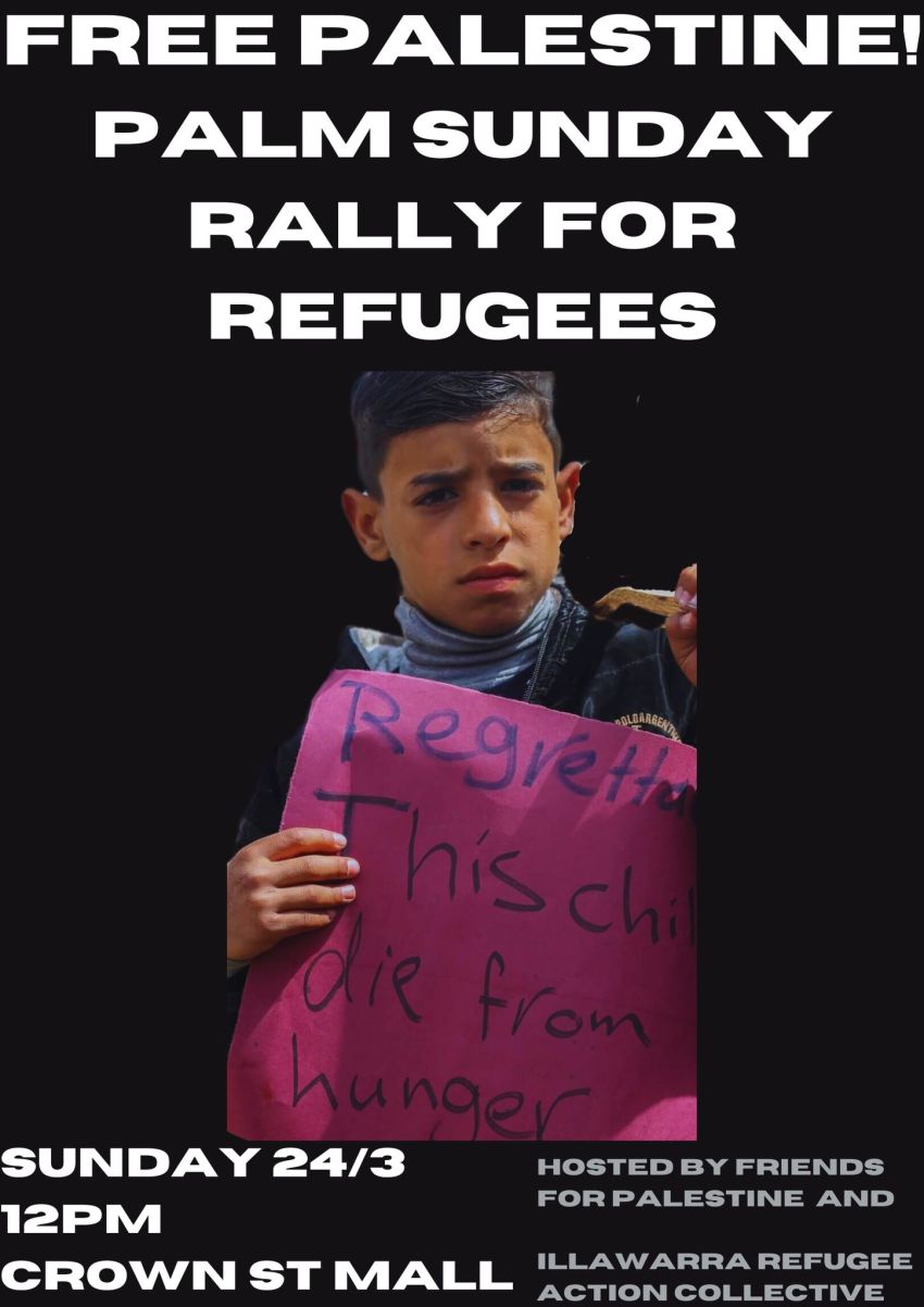 Annual Palm Sunday rally and march for Refugees. This year we will be joined by Wollongong Friends of Palestine to call for an end to the Australian government's detestable attitudes to refugees and an end to their complicity in the genocide in Gaza.