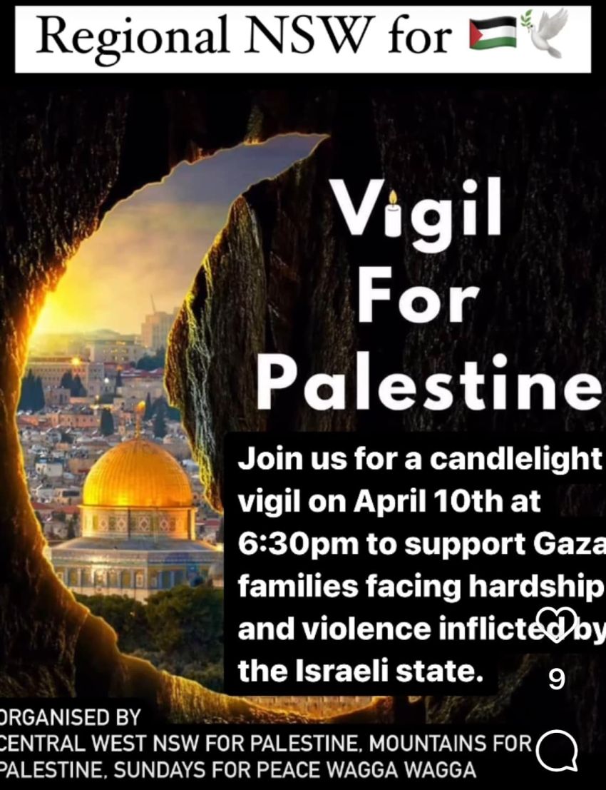 If you are unable to attend please still participate. Light a candle at dusk and post your message of support to the people Gaza on Facebook/Instagram, don’t forget to tag us: @SundaysforPeace_wagga and @central_west_nsw_for_palestine (and if you can also tag your local politicians).