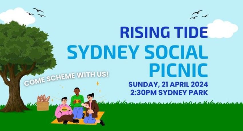 Join Rising Tide Sydney near the playground at Sydney Park for a family-friendly afternoon of socialising and scheming!