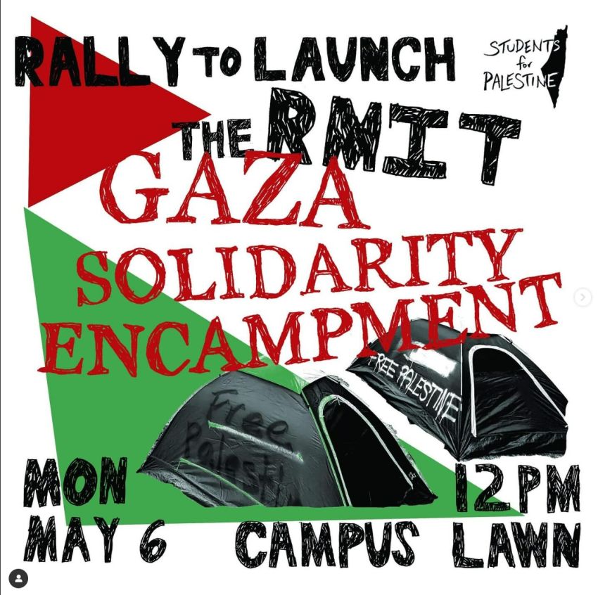 Be at the rally to launch the RMIT Gaza Solidarity Encampment on monday!!